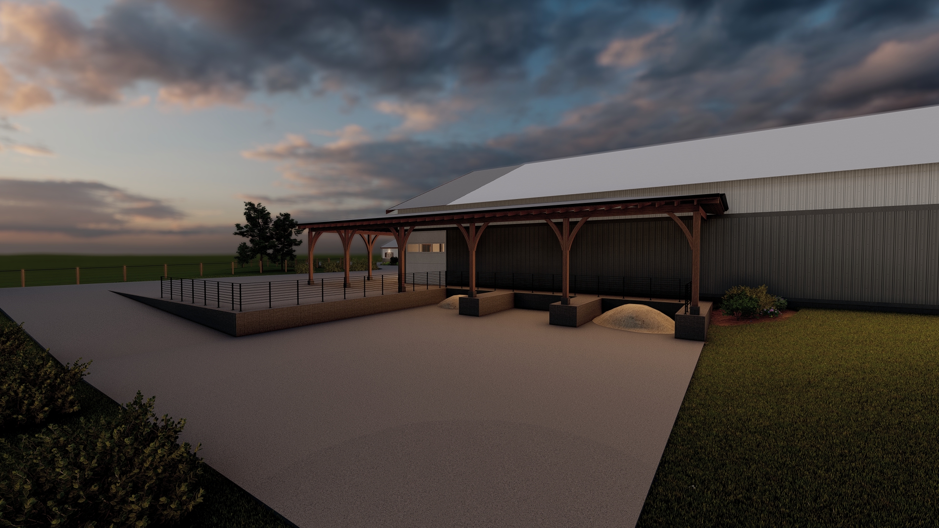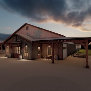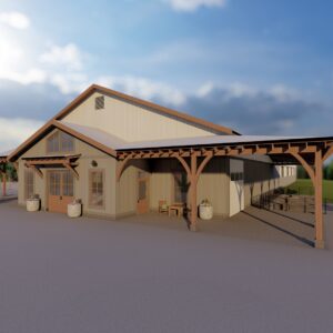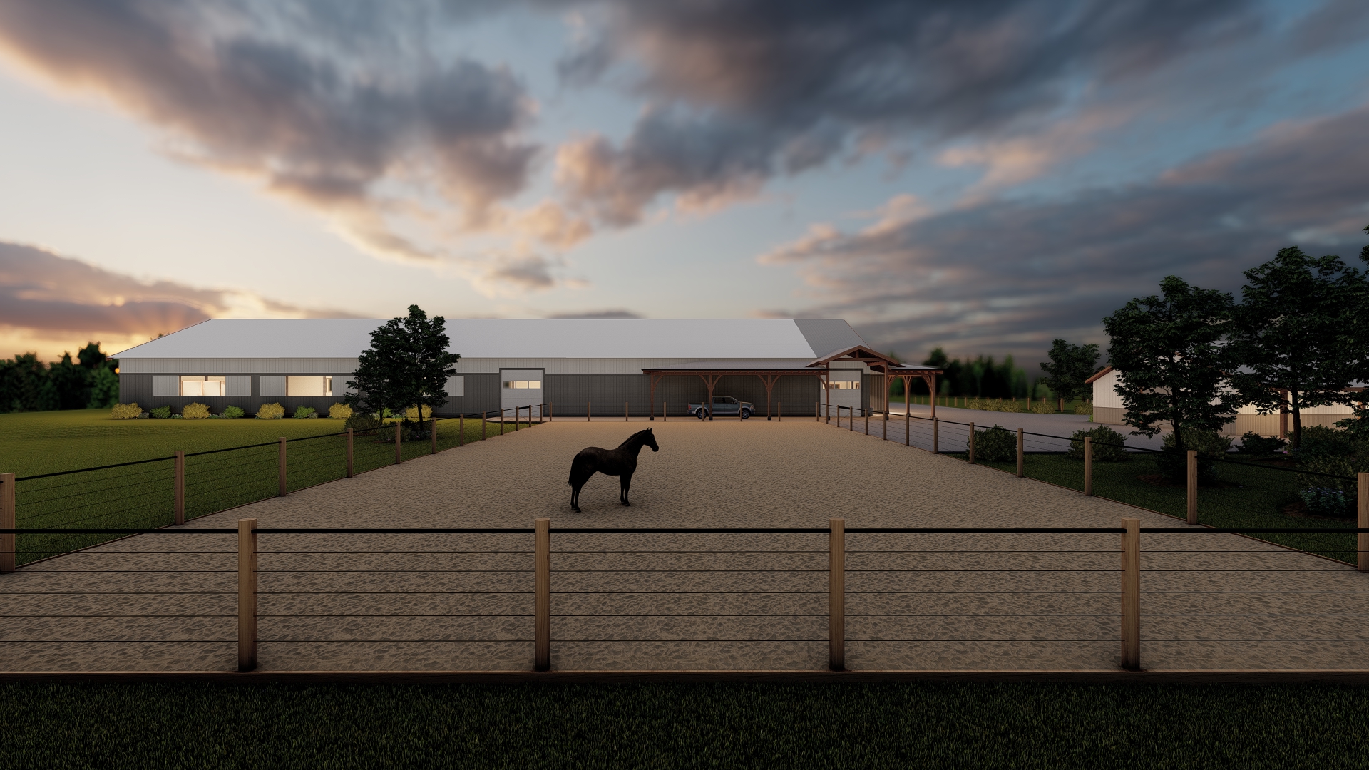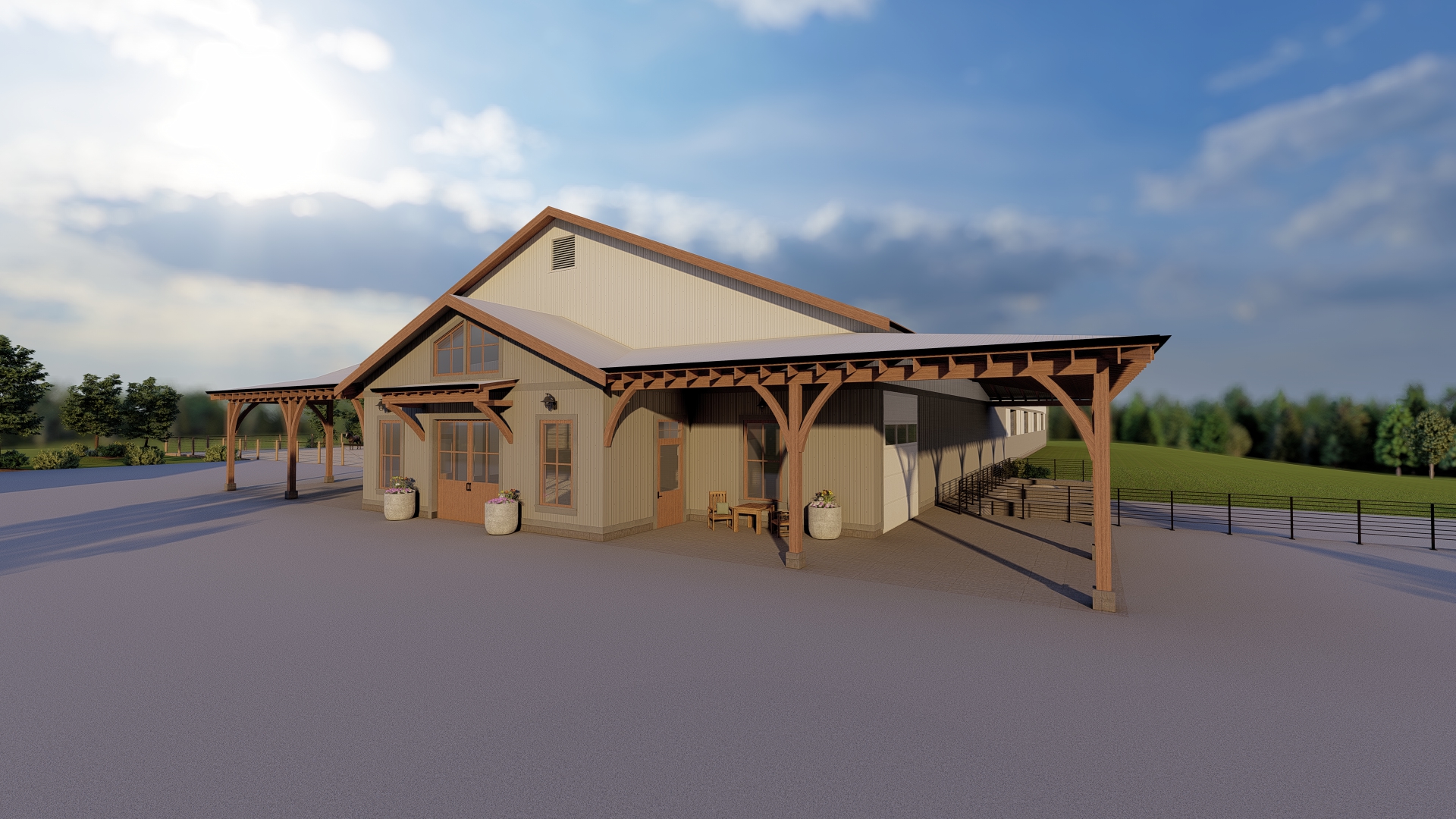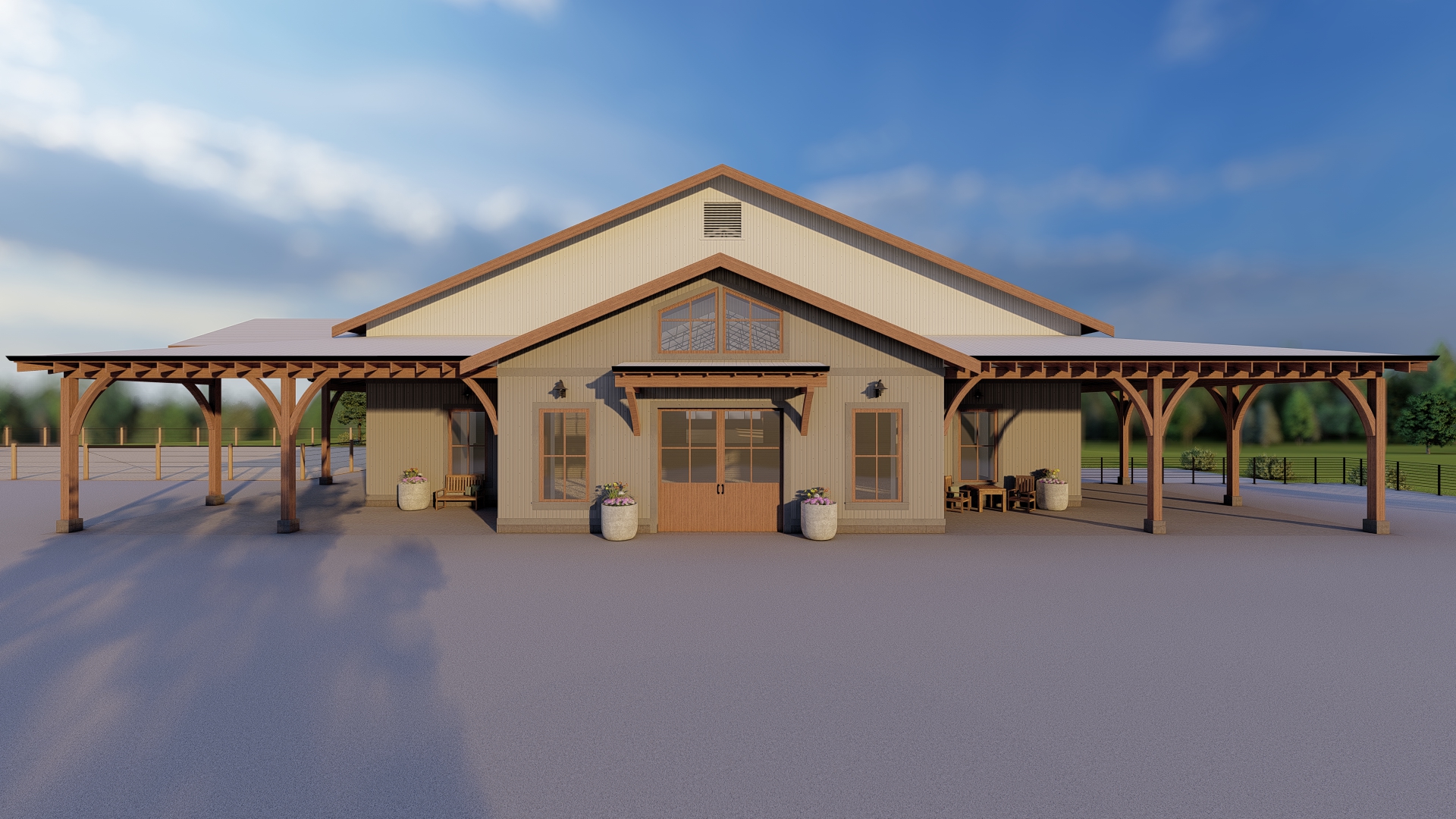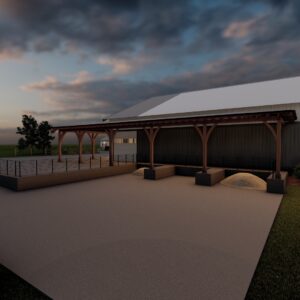 Timber posts, knee braces, and roof accents tie this design together to display a rustic yet polished arena. This project is currently completed and we look forward to sharing actual photos very soon.