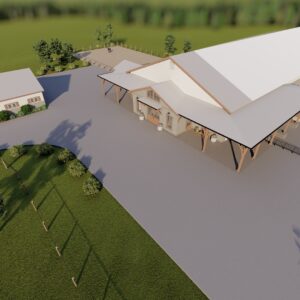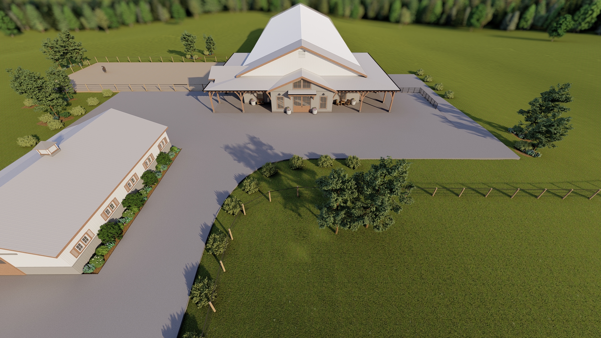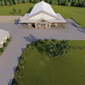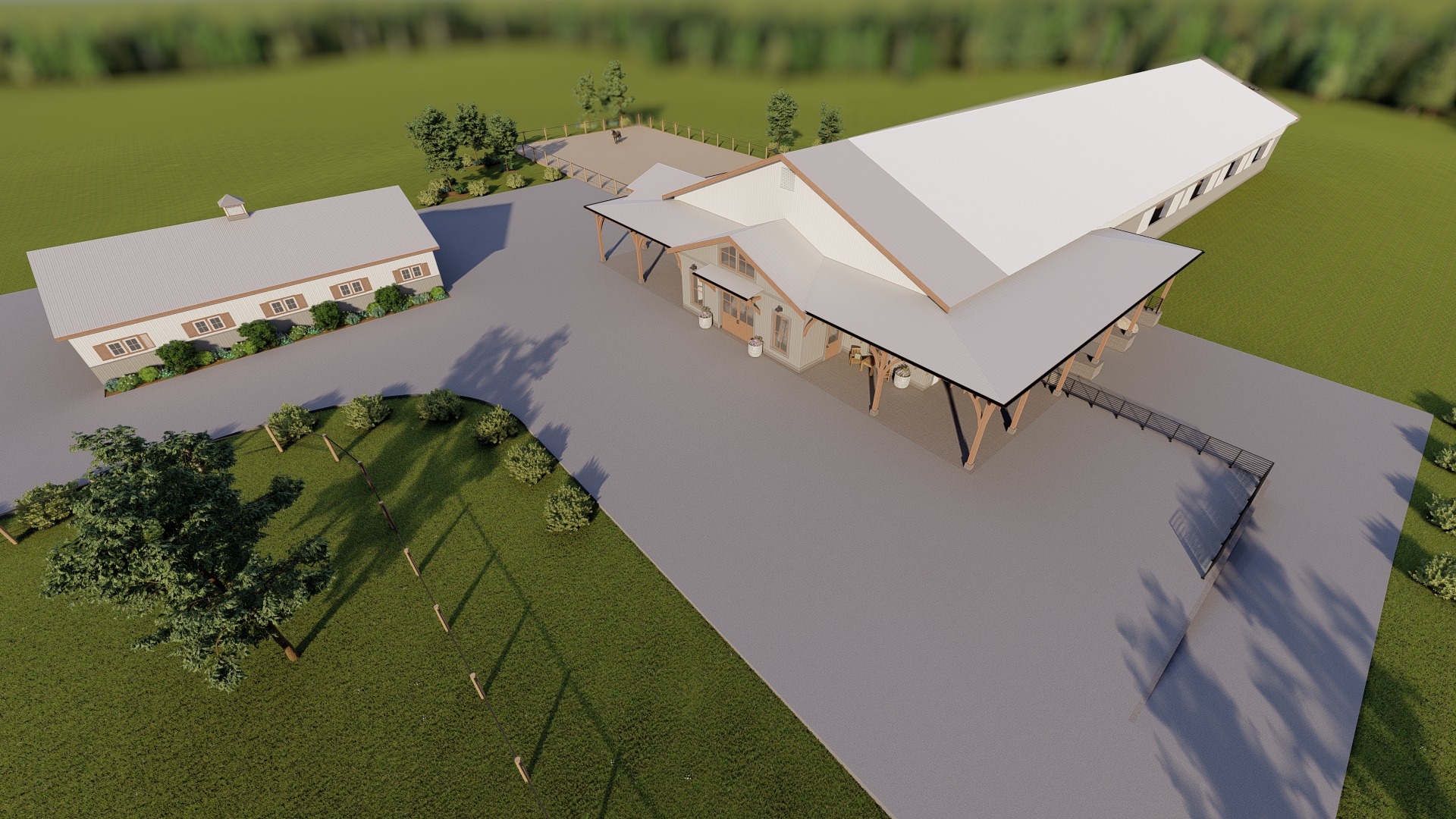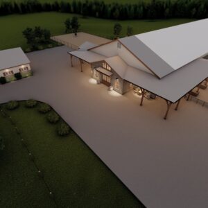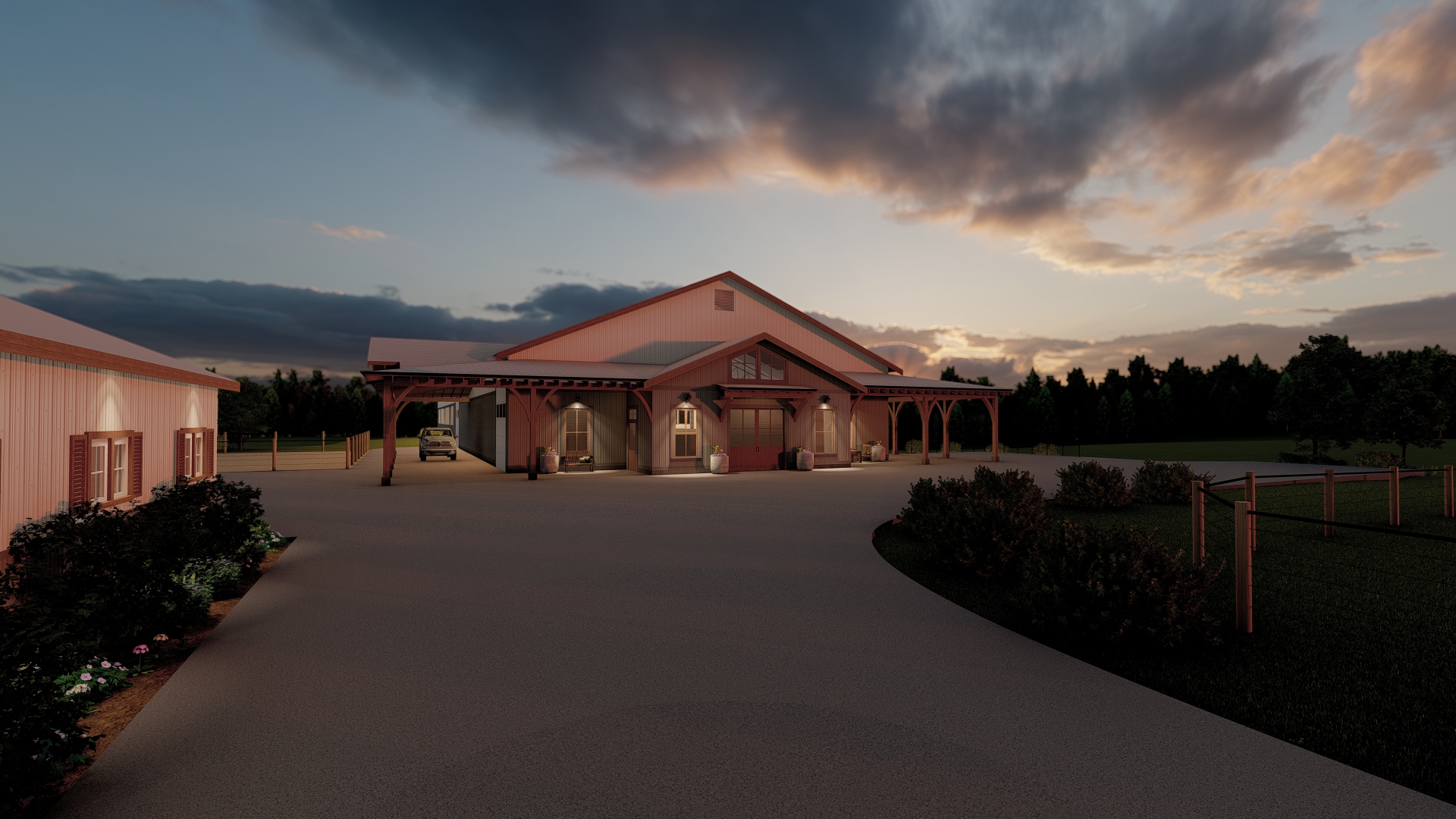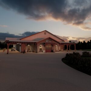 Timber posts, knee braces, and roof accents tie this design together to display a rustic yet polished arena. This project is currently completed and we look forward to sharing actual photos very soon.