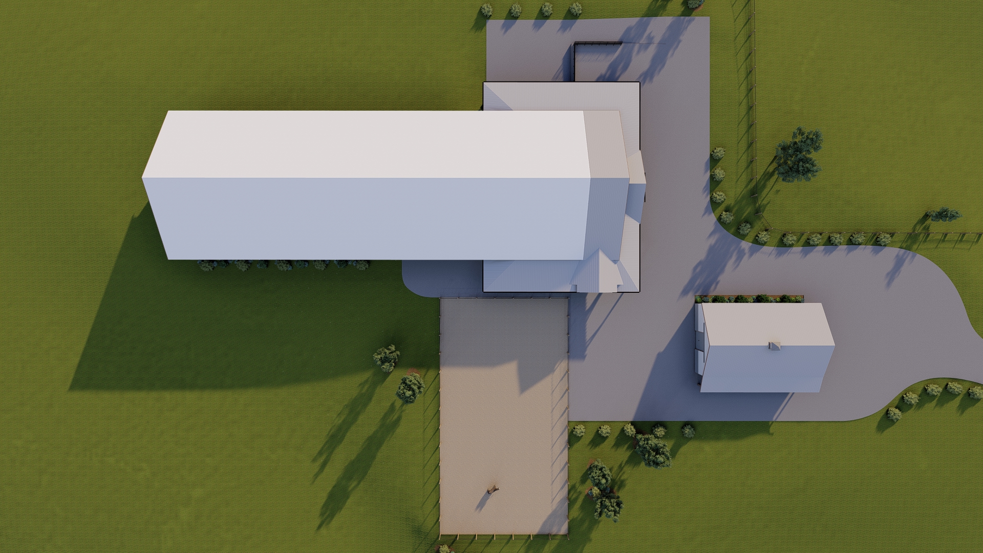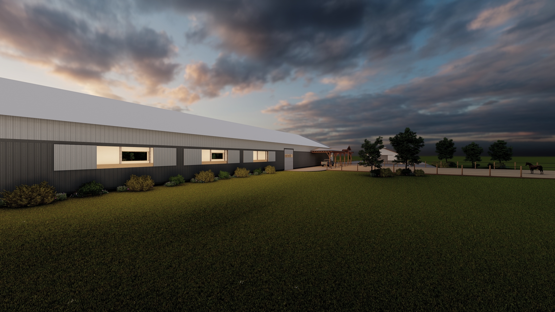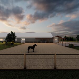 This 20 by 60 meter indoor arena houses a spacious riding area alongside an outdoor arena. Indoor, the facility includes storage space for jump equipment, an angled kick wall, wide windows, and mirrors along the back wall. Outdoor, some features that set this building apart include covered trailer parking, manure composting bins, and multiple garage door openings to ensure easy entrance for vehicles and machinery.